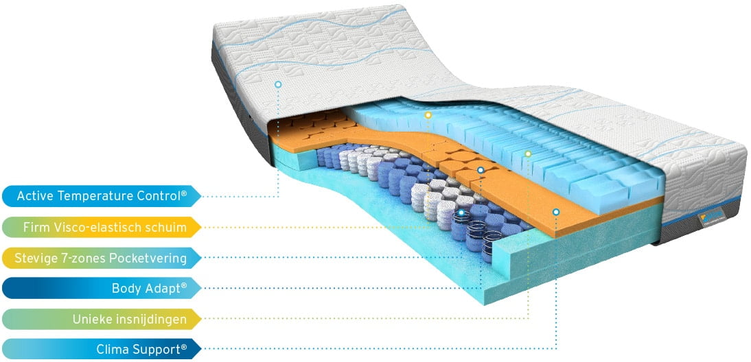 De opbouw van beide matrassen bestaat uit een 7-zone pocketvering. Deze apart verpakte veren geven het lichaam een goede ondersteuning door de onafhankelijke werking. Elke veer geeft een eigen druk en sluit hiermee aan op het lichaam. Bovenop de pocketvering zit een drukverdeler van koudschuim. Deze drukverdeler heeft ruime ventilatie gaten en geeft een goede warmte- en vochtafvoer. De bovenlaag van het unieke M Line Visco Elastische ISM schuim. Dit unieke schuim heeft insneden waardoor het snel hersteld en zeer comfortabel aanvoelt. M Line zorgt voor een perfecte nachtrust, maar ook dat u weer fris opstaat!