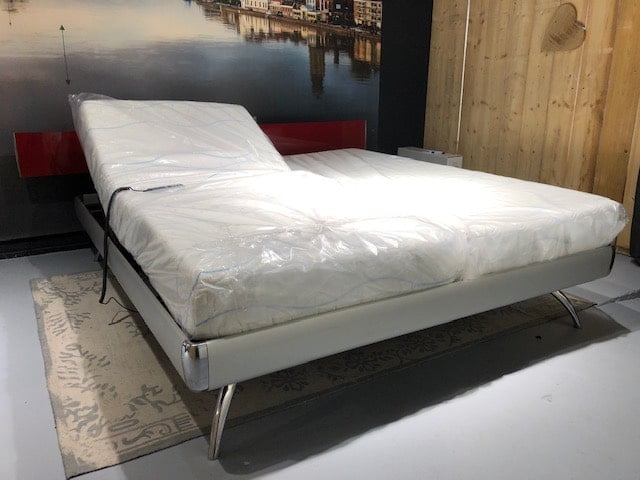 Auping Auronde Match ‘Aluminium’ 180×210 incl volledig Elektrisch verstelbare 2-motorige Auping spiraalbodems, Auping Match Hoofdbord ‘Straight in Karmijn Rood hoogglans, M Line Cool Motion Hybrid 5 en M Line Cool Motion Hybrid 7 matras en Gratis bezorging en montage in Nederland!