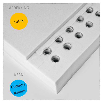De 7-zone pocketvering zorgt, in combinatie met het Kapua schuim, voor een goede drukverdeling en ventilatie in het matras. Waarbij de pocketvering zorgt voor de juiste drukverdeling op de drukpunten, zorgt het Kapua schuim voor een heerlijk soepel comfort rondom de pocketveren. Het matras is door deze unieke combinatie soepel, maar wel zeer solide en sterk in comfort. De soepel toplaag van 5 centimeter hoogwaardig latex geeft uw drukverlichting en hierdoor ervaart u weinig tot geen druk op uw heupen en schouders.