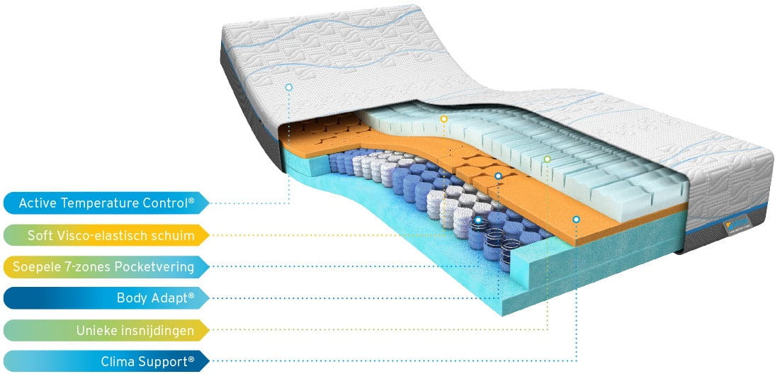 Doordat de pocketvering in 7 verschillende delen is verdeeld, sluit het perfect aan op de lichaamcontouren. Deze betere zonering bevordert het herstel van uw spieren en gewrichten tijdens de nachtrust. Dankzij een goed slaapklimaat zult u overdag beter presteren. Het Body Adapt systeem zorgt ervoor dat u een stabielere en nog mooie ondersteuning krijgt van het lichaam. De toplaag van geprofileerd visco elastisch schuim zorgt ervoor dat het lichaam op ieder punt wordt ondersteund, waar het lichaam de ondersteuning nodig heeft.