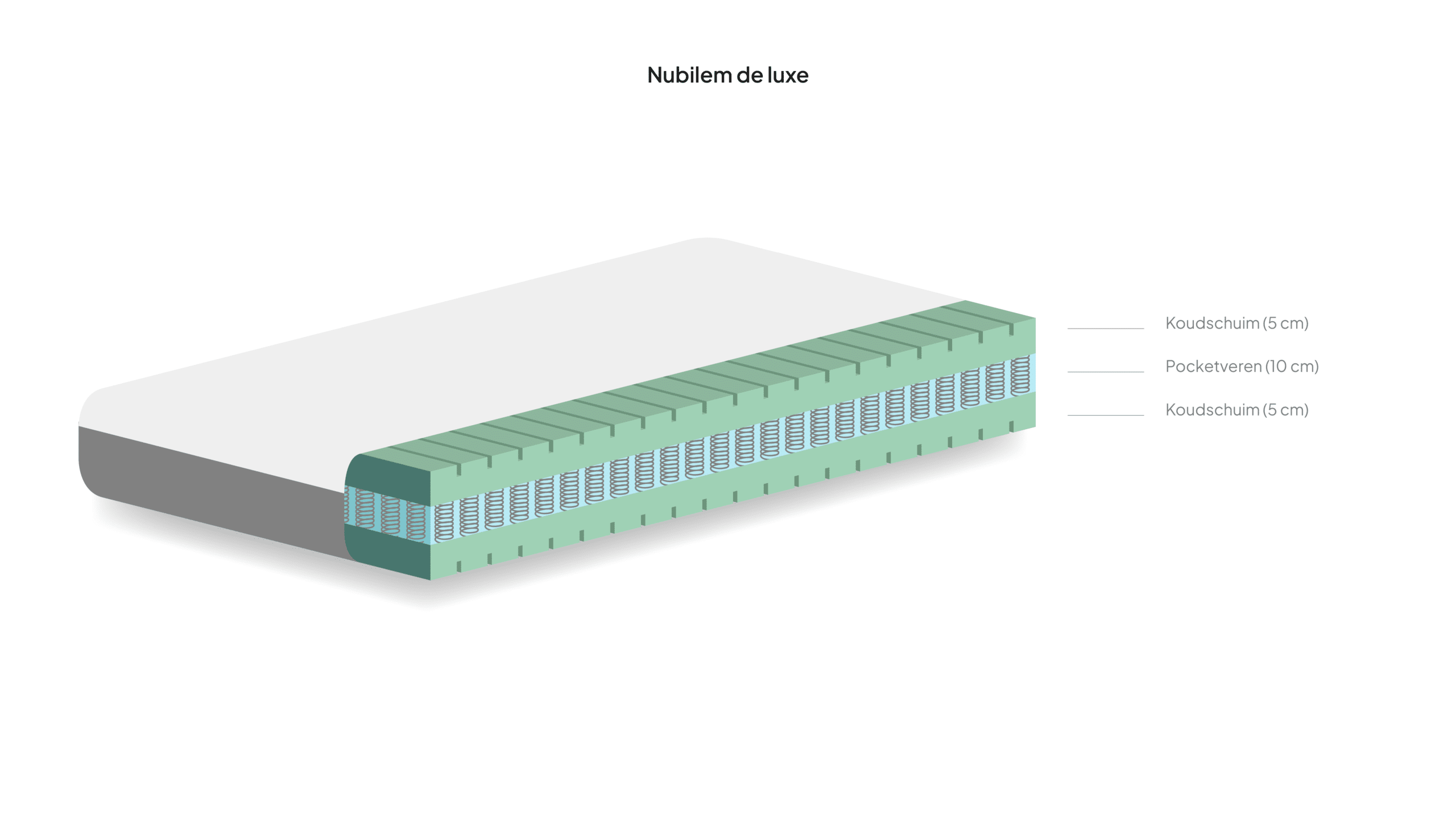 De pocketveer koudschuim matras ‘Nubilem de Luxe’ is 21 cm. dik en bestaat uit een pocketgeveerde kern met 7 comfort zones en aan twee kanten een afdekking van maar liefst 5cm gecontourd koudschuim met een densiteit van 55 (HR55). De koudschuim afdekking en de luchtige pocketveren kern zorgen ervoor dat het bekend staat als een van de best ventilerende matrassen. Het is een koele afdekking, het houdt dus weinig tot geen lichaamswarmte vast. Koudschuim matrassen beschikken over goede tot zeer goede ventilatie-eigenschappen, de open celstructuur is hiervoor verantwoordelijk. Vochtophoping in het matras wordt hierdoor voorkomen.